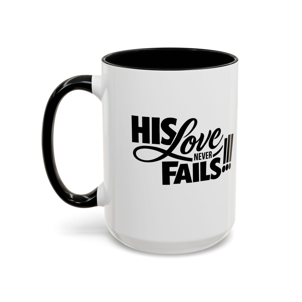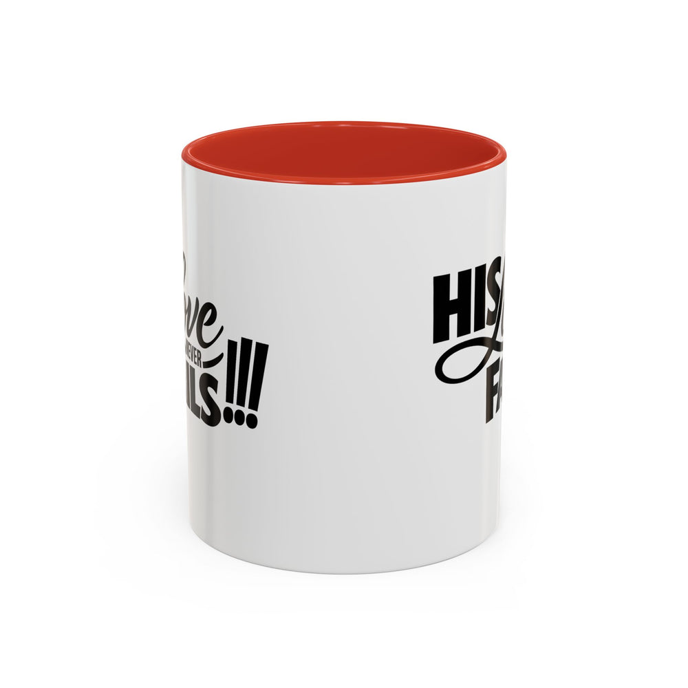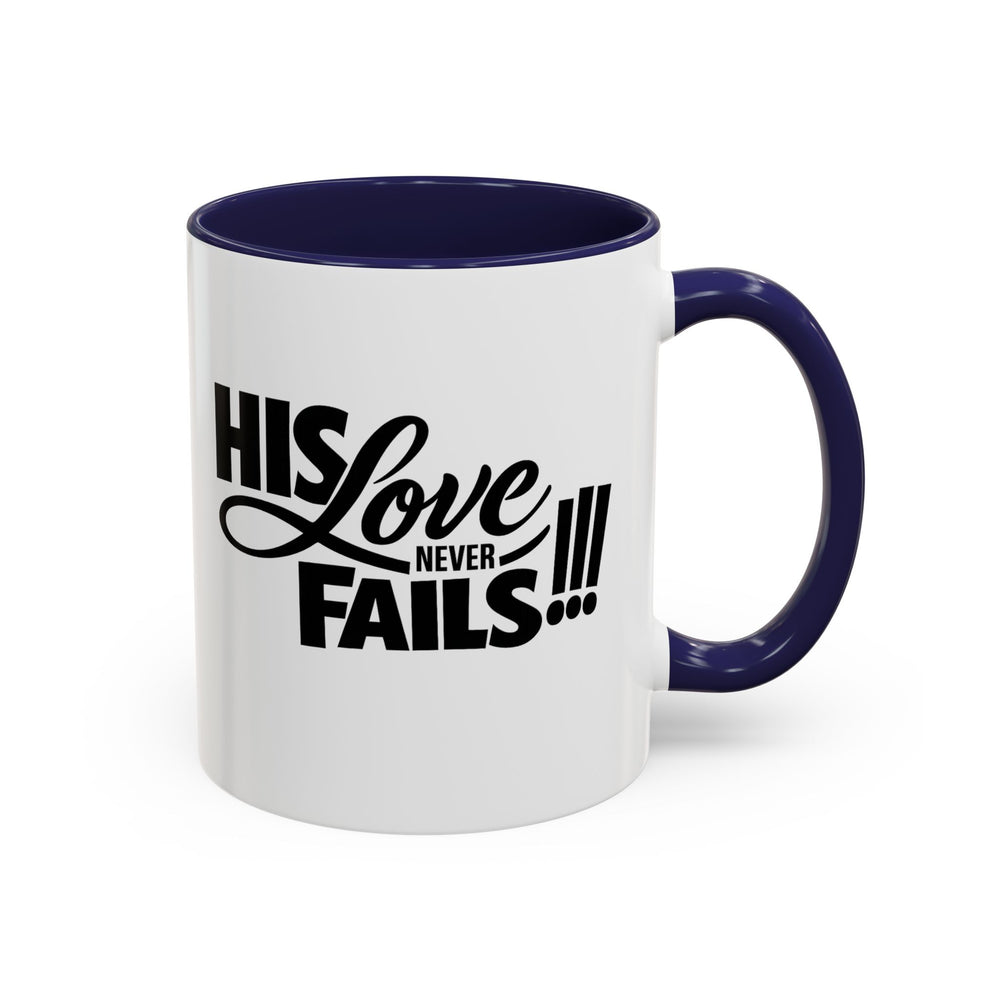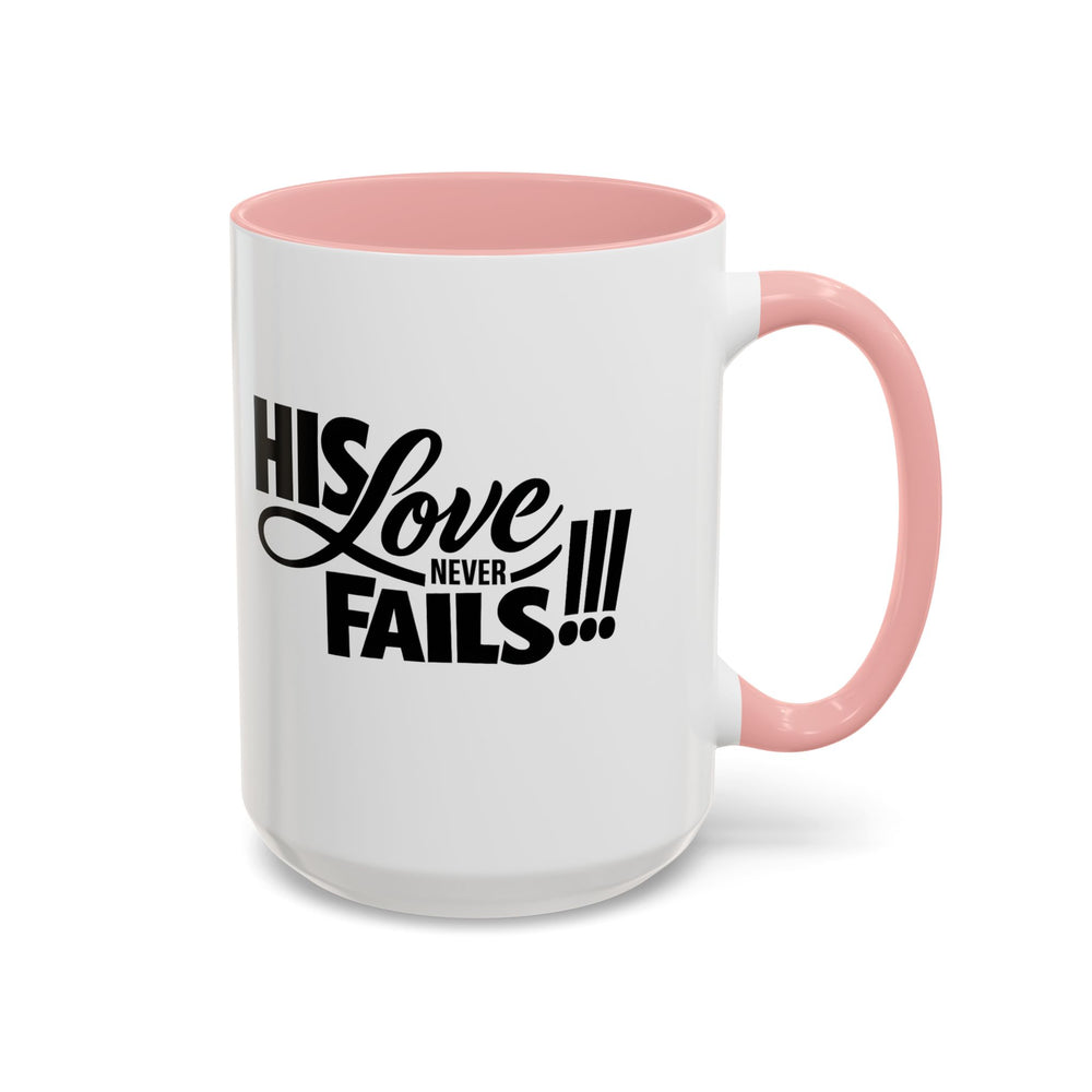 This ceramic accent mug brings a quiet, confident reminder to your daily routine: His love never fails. The bold black script sits crisply against the glossy white exterior while the colored interior and handle add that subtle pop you’ll reach for every morning. It feels sturdy in the hand thanks to the C-shaped handle and smooth finish, and the larger 15oz option holds an extra pour for slower mornings or longer conversations. It’s dishwasher- and microwave-safe, lead- and BPA-free, and printed with vibrant inks that keep the lettering sharp through regular use.