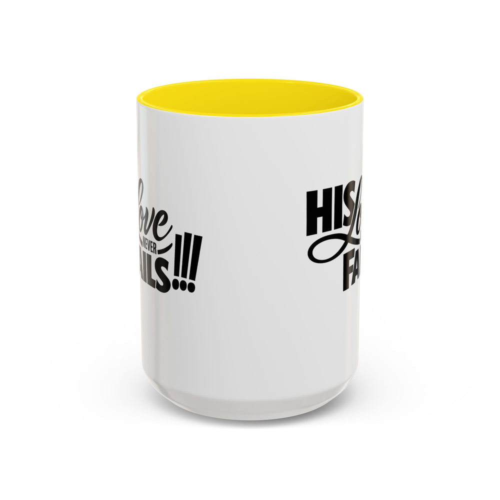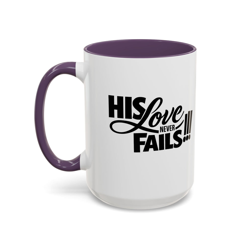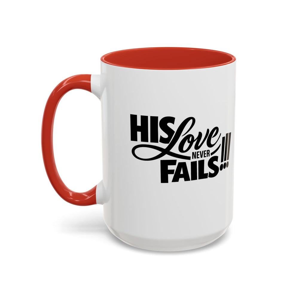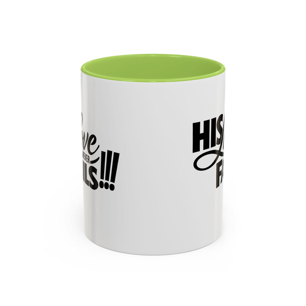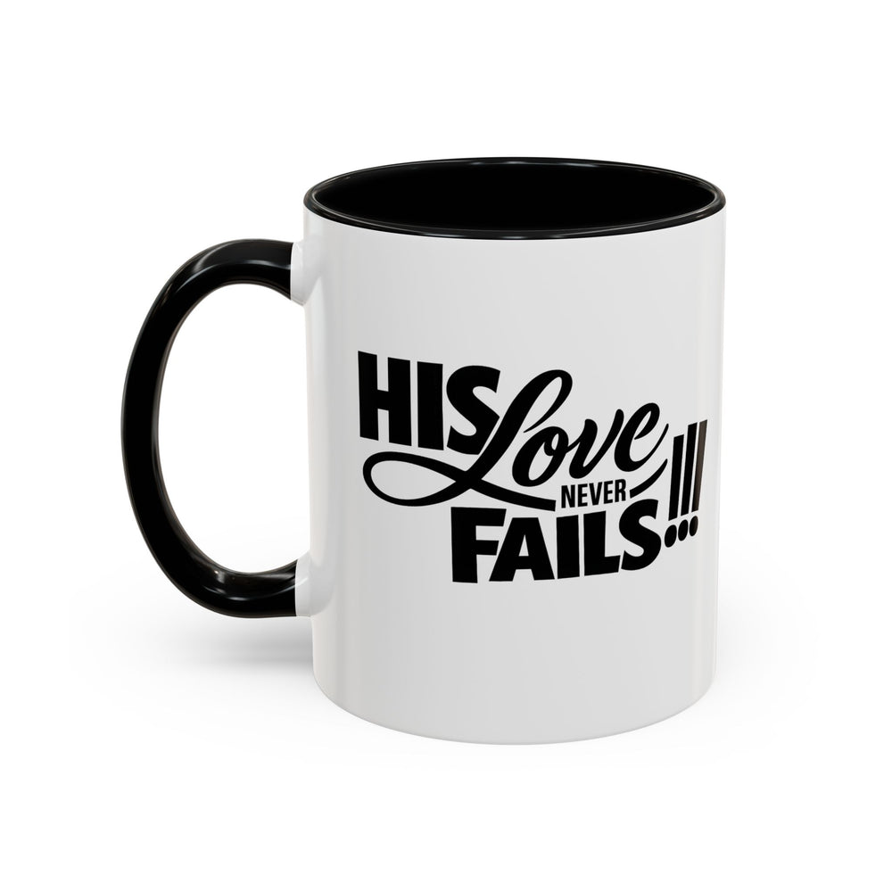 This ceramic accent mug brings a quiet, confident reminder to your daily routine: His love never fails. The bold black script sits crisply against the glossy white exterior while the colored interior and handle add that subtle pop you’ll reach for every morning. It feels sturdy in the hand thanks to the C-shaped handle and smooth finish, and the larger 15oz option holds an extra pour for slower mornings or longer conversations. It’s dishwasher- and microwave-safe, lead- and BPA-free, and printed with vibrant inks that keep the lettering sharp through regular use.