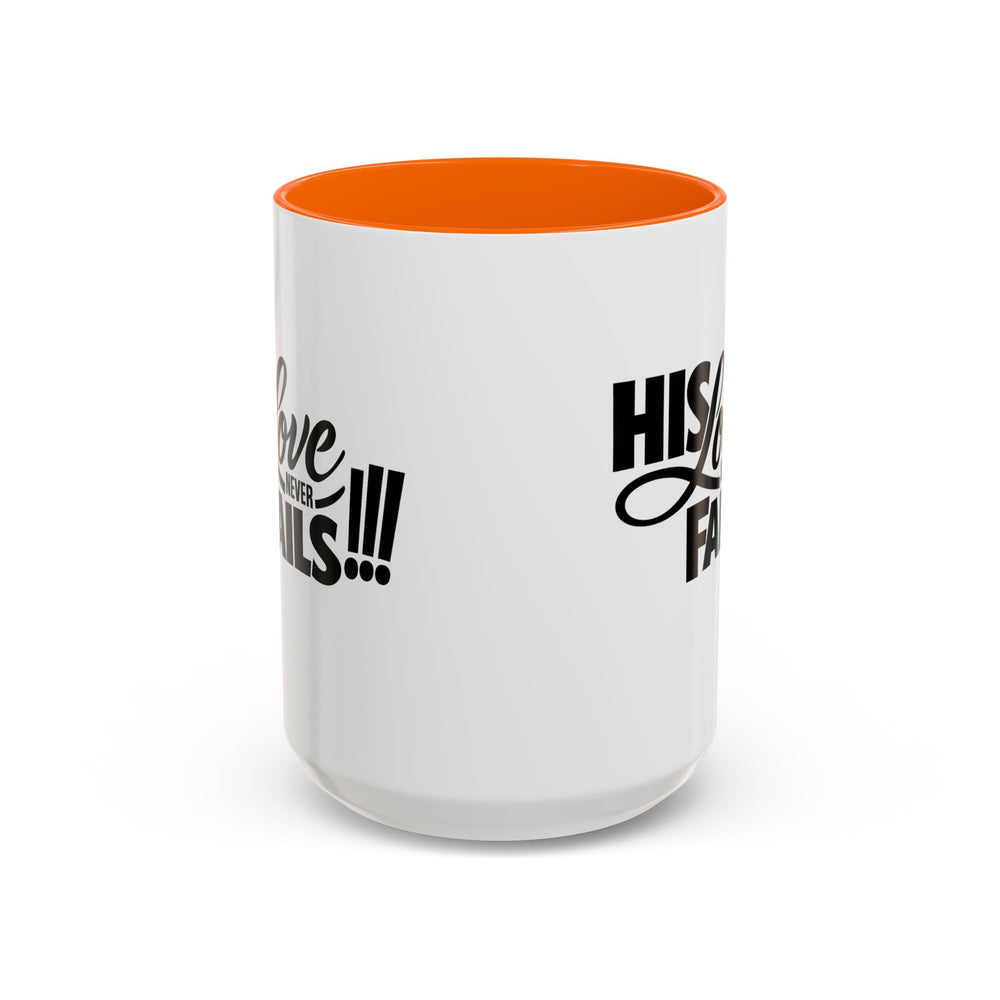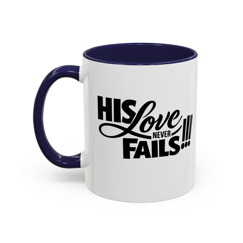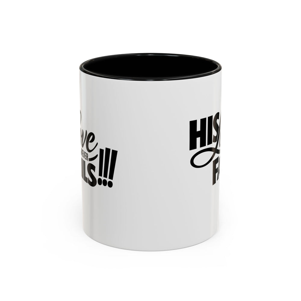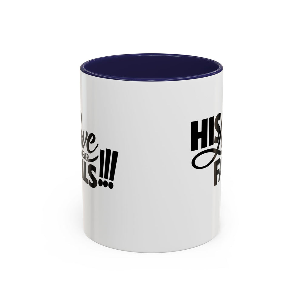 This ceramic accent mug brings a quiet, confident reminder to your daily routine: His love never fails. The bold black script sits crisply against the glossy white exterior while the colored interior and handle add that subtle pop you’ll reach for every morning. It feels sturdy in the hand thanks to the C-shaped handle and smooth finish, and the larger 15oz option holds an extra pour for slower mornings or longer conversations. It’s dishwasher- and microwave-safe, lead- and BPA-free, and printed with vibrant inks that keep the lettering sharp through regular use.